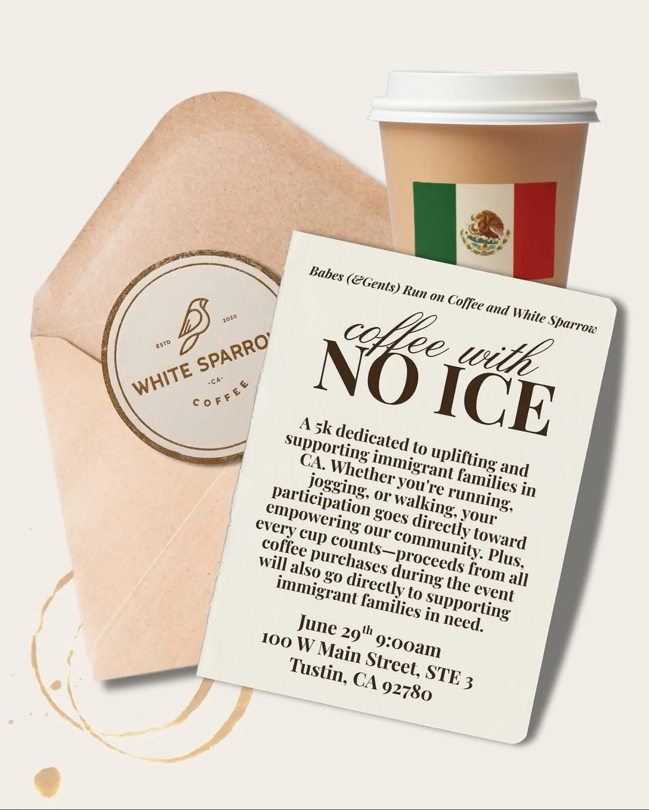 Back to All Events Coffee with NO ICE Sunday, June 29, 2025 9:00 AM 12:00 PM White Sparrow Coffee 100 West Main Street Tustin, CA, 92780 United States (map) Google Calendar ICS Serving up breakfast sandos & hash